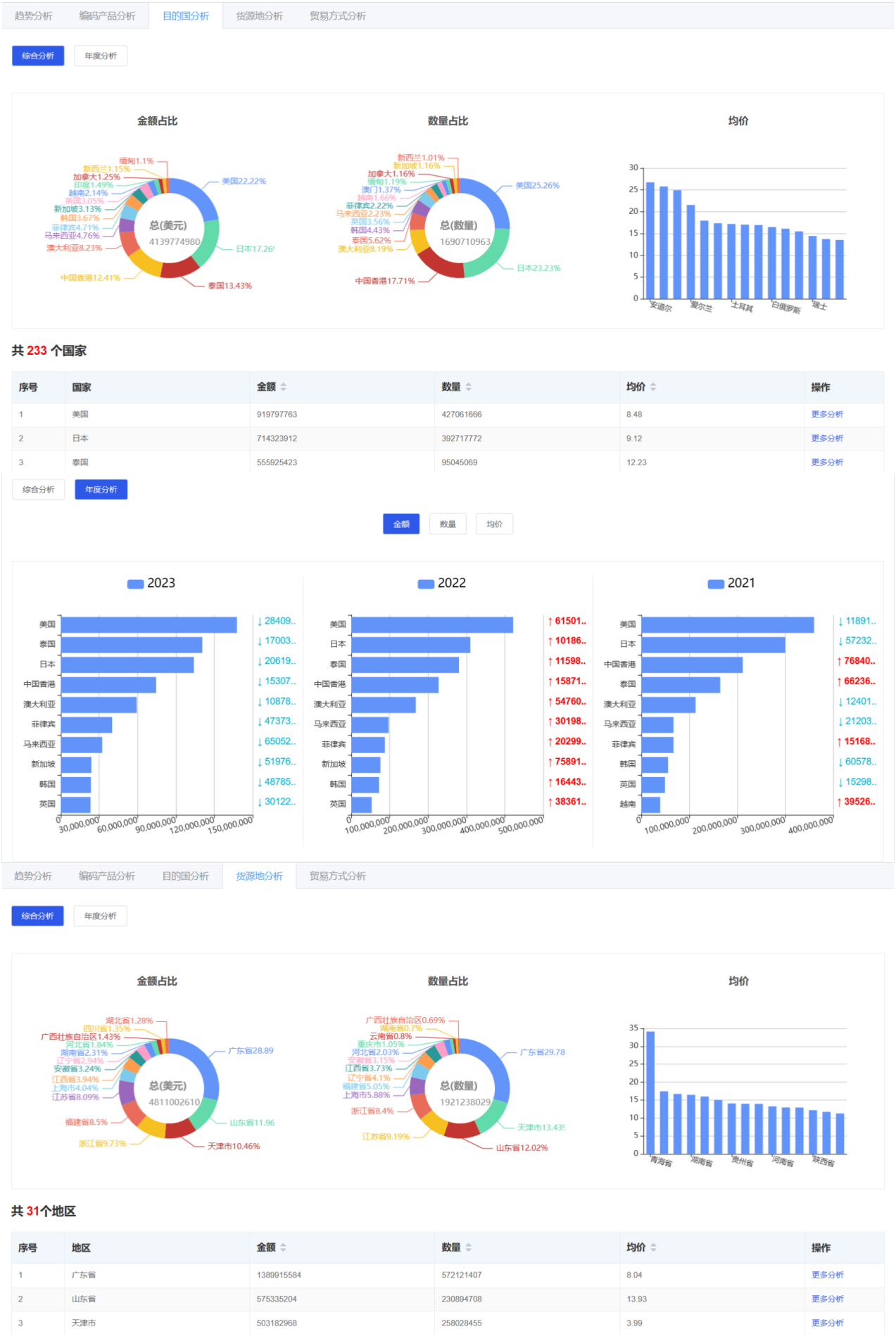 就编码4818商品——卫生纸及类似纸等而言,我国从2021年1月至2023年4月出口的目的国/地共计233个,其中前三位(以金额占比计)为美国、日本和泰国;国内共有31个省出口卫生纸及类似纸等,前五大出口省份(按金额占比计)集中度达到69.54%,其中排名第一的为广东省。